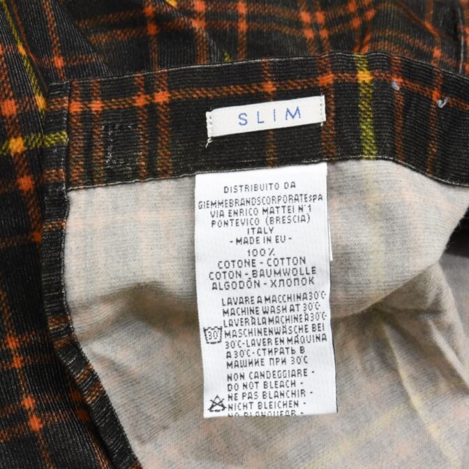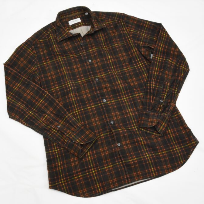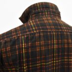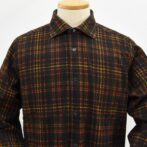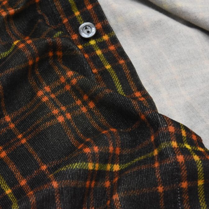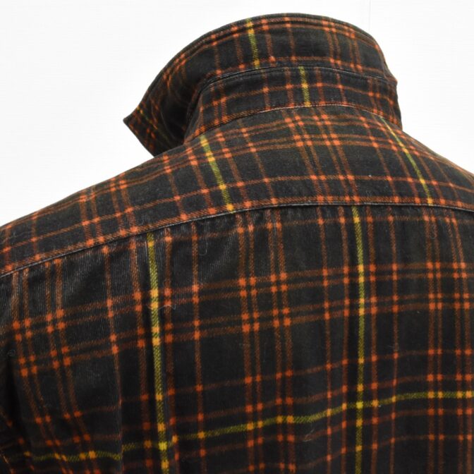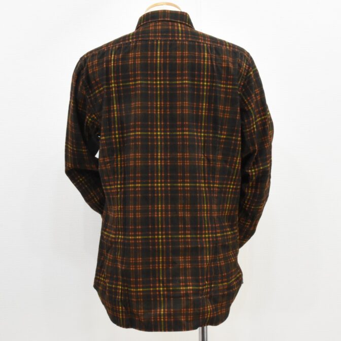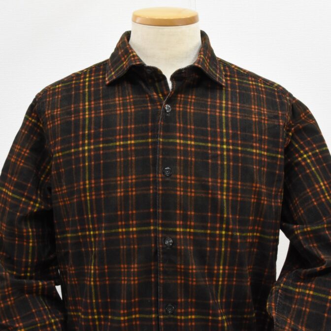 ブラウンのベースにオレンジ、グリーンが入ったチェック柄で、マイクロコーデュロイの素材と相まってとても雰囲気のあるシャツです。