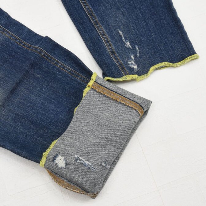 スキニーシルエットで、すそがライトグリーンのロックステッチになっています。
