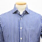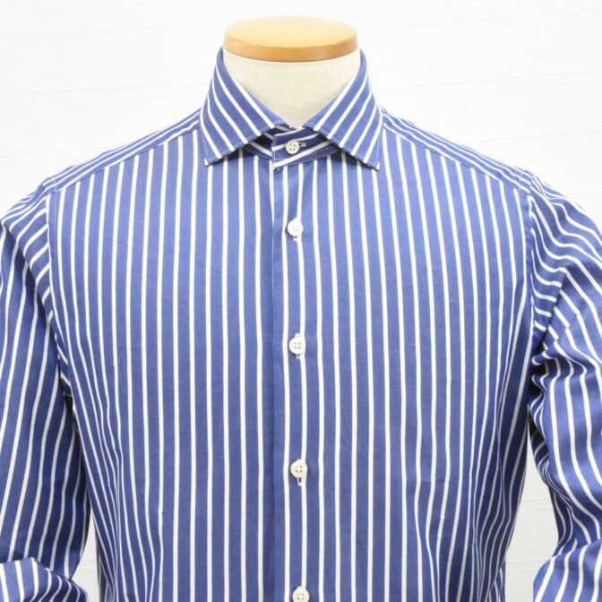 剣先がやや短めのホリゾンタルカラーでノータイで着た時の襟の形もかっこいいシャツです。